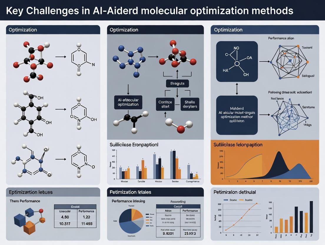 This article provides a comprehensive analysis of the key technical and practical challenges facing AI-aided molecular optimization in drug discovery. Targeting researchers and pharmaceutical professionals, it explores foundational concepts, methodological limitations, real-world troubleshooting, and validation hurdles. By dissecting issues from data scarcity and molecular representation to synthetic feasibility and model interpretability, the review offers a critical roadmap for advancing AI from a promising tool to a reliable engine for generating novel, optimized therapeutic candidates.