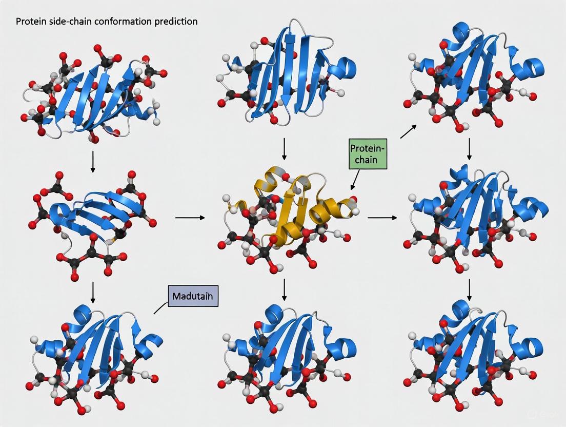 The eight side-chain conformation prediction methods analyzed herein employ diverse algorithmic strategies, ranging from rotamer library-based algorithms to machine learning and deep learning approaches [3] [10]. Their performance is typically evaluated by measuring the accuracy of predicted side-chain dihedral angles (χ angles) or the root-mean-square deviation (RMSD) of atomic coordinates from experimentally determined structures.
